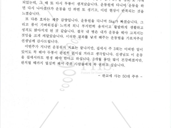 11월달에 등록해 운동을 해왔는데 치료가 (100%) 된 것 같다. 11월달에 등록해 운동을 해왔는데 치료가 (100%) 된 것 같다.  작성자 PHS / 조회 994 / 작성일 08-08